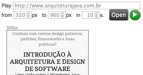 Além disso, o Responsive Play tem uma versão web pra você rodar no navegador e visualizar seu site em diversas resoluções, sem gerar o vídeo. É só acessar a página e colocar o endereço de teste.